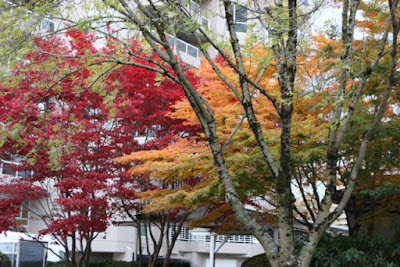The larger trees have pretty much lost their leaves. The smaller maples are hanging on to theirs and there are still a few green ones around.